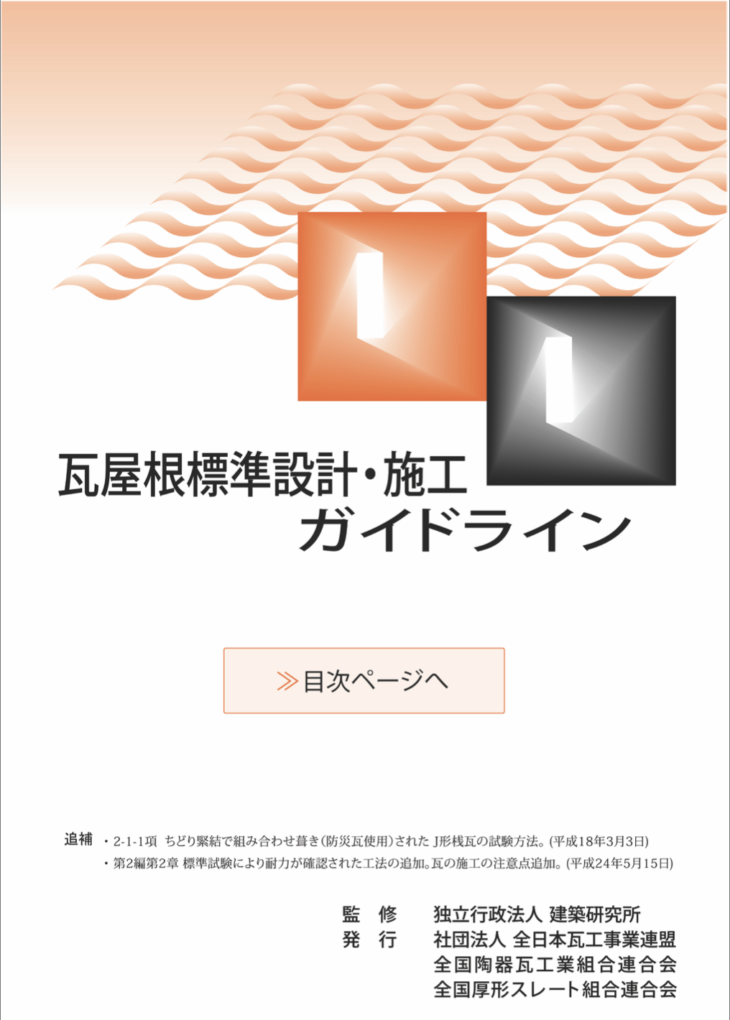 国土交通省は、瓦屋根について建築基準法の告示基準を改正。これまで業界団体が独自に、告示基準を上回るようなガイドライン工法を策定し、強風に備えた施工を進めてきており、このガイドライン工法を基準とすることと定めました。 新築ではこの基準を義務付けるため告示を改正するが、増改築の際でも既存建築部分にさかのぼっては適用はしないらしい。