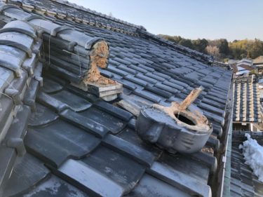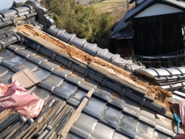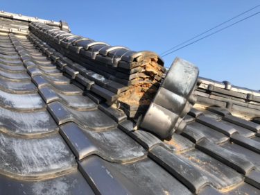 施工をする前のお写真です。鬼瓦が外れてしまった状態。瓦を固定するための土葺きが見えてしまっています。