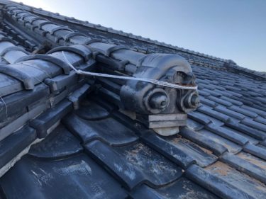 下り棟の落下により、鬼瓦がはずれてしまったというお問い合わせを頂き、現地調査させて頂きました。 鬼瓦をとめる銅線が、経年劣化により切れてしまっていたので、鬼瓦が今にも軒先に落下しそうで大変危険でしたので、ご連絡を頂いてすぐに応急処置に伺わせて頂きました。 |
