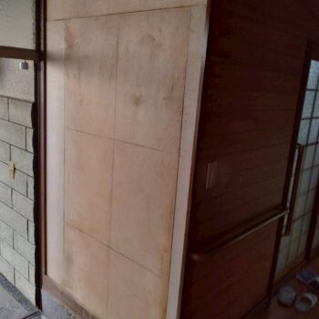玄関横の壁は下地を整えたうえで合板を張り、仕上げに向けて面をまっすぐに調整。開口部まわりも納まりを確認しながら丁寧に施工しています。