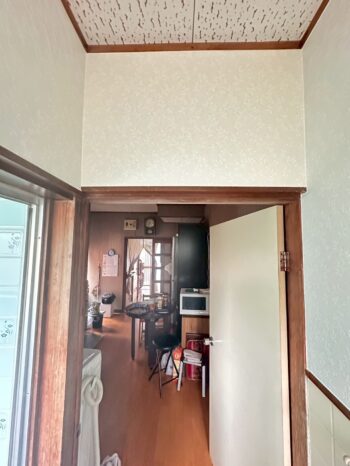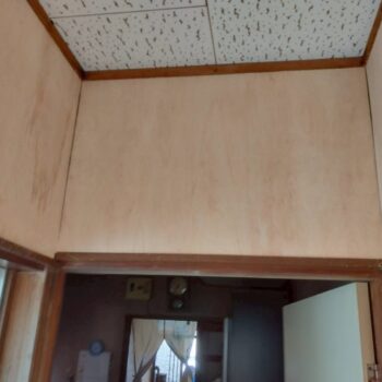 廊下の建具上部は下地の状態を確認し、合板で補強しながら壁面を整えました。段差や反りが出ないよう、ラインを揃えて仕上げ準備を進めています。