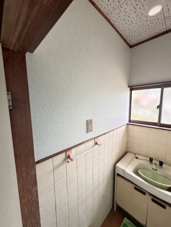 洗面まわりは壁面を整えてクロスを貼り替え、明るく落ち着いた空間に。水まわりでも見映えよく、日々のお手入れもしやすい仕上がりです。
